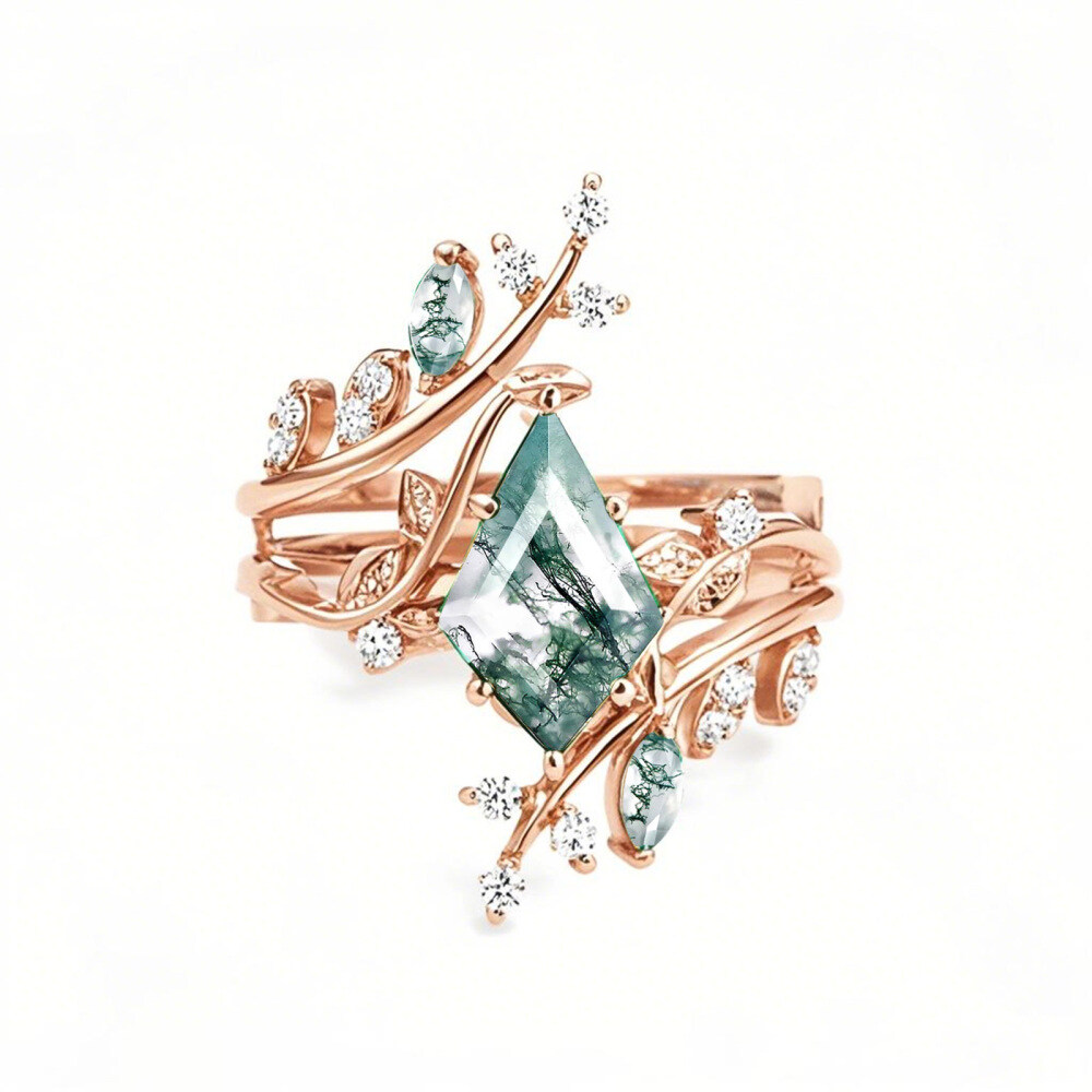 Entdecken Sie die Eleganz unseres atemberaubenden Brautsets aus luxuriösem 10-karätigem Roségold für die moderne Frau. Mit einem faszinierenden großen Mittelstein aus Moosachat, ergänzt durch funkelnde Moissanit-Seitensteine, strahlt dieses exquisite Schmuckstück Raffinesse aus und ist perfekt, um ewige Liebe zu feiern.