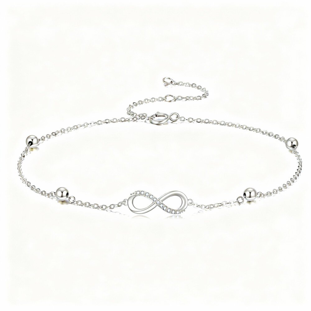 Entdecken Sie unser elegantes 10K Weißes Gold-Armband mit unendlichem Symbol-Anhänger, das für Frauen entworfen wurde und eine wunderschöne runde Form hat, die mit funkelnden Zirkonia verziert ist.