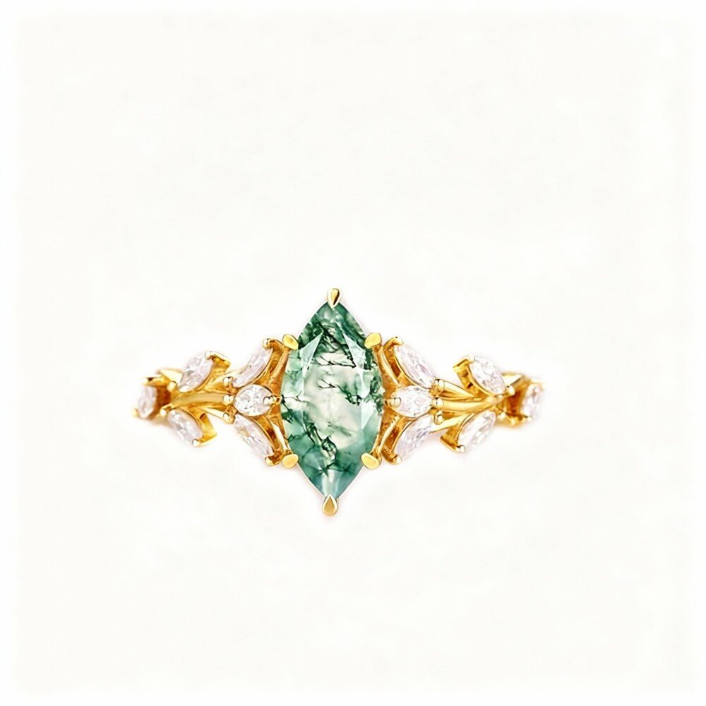 Unser atemberaubender Verlobungsring aus 18K Gold verfügt über einen exquisit geschliffenen Moosachat im Marquise-Schliff in der Mitte, umgeben von einem wunderschönen floralen Clusterdesign. Der 1 Karat Moosachat ist nicht nur eine elegante Wahl, sondern symbolisiert auch Wachstum und Erneuerung, was ihn perfekt für Ihre einzigartige Liebesgeschichte macht. Die warmen, reichen Töne des Golds ergänzen die organischen Farbtöne des Moosachats wunderbar und schaffen eine harmonische Verbindung von Natur und Luxus. Dieser Ring ist mehr als nur ein Schmuckstück; er ist eine Darstellung Ihres ewigen Engagements und der Reise, die Sie gemeinsam antreten werden. Egal, ob Sie um die Hand anhalten oder einen wichtigen Jahrestag feiern, dieser Ring wird als perfektes Erinnerungsstück an Ihre Liebe und Hingabe dienen.