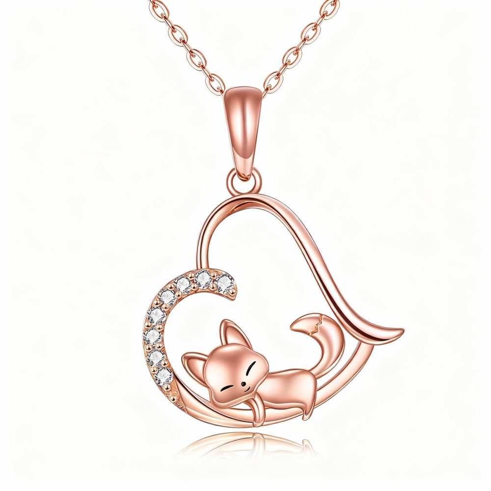 Entdecken Sie unsere exquisite 18K Roségold Anhänger Halskette, entworfen für Frauen, die einzigartige Schmuckstücke lieben, mit einem faszinierenden Fuchs- und Herzmotiv, verziert mit funkelndem Zirkonia.