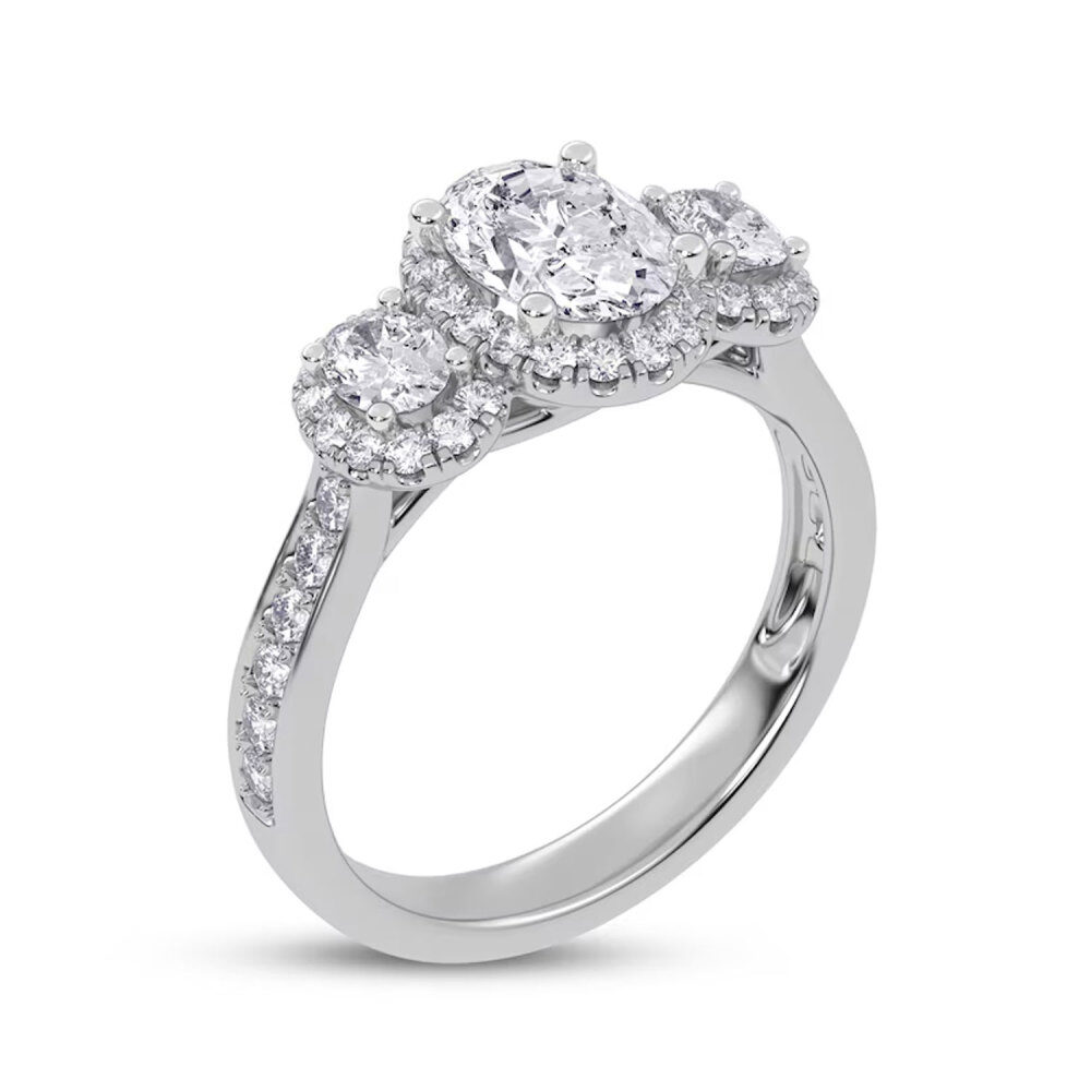 Veredeln Sie Ihren Antrag mit unserem atemberaubenden Verlobungsring aus luxuriösem Platin und Weißgold, der mittig einen exquisiten, im Ovalschliff gefertigten Diamanten aus künstlichem Diamanten ziert. Dieses außergewöhnliche Schmuckstück besticht durch ein wunderschönes Halo-Design mit zwei weiteren Steinen mit einem Gesamtgewicht von 1,5 Karat. Die brillante Farbe D und die Reinheit VVS1-VS1 garantieren ein strahlendes Funkeln, das die Essenz Ihrer Liebesgeschichte einfängt.
