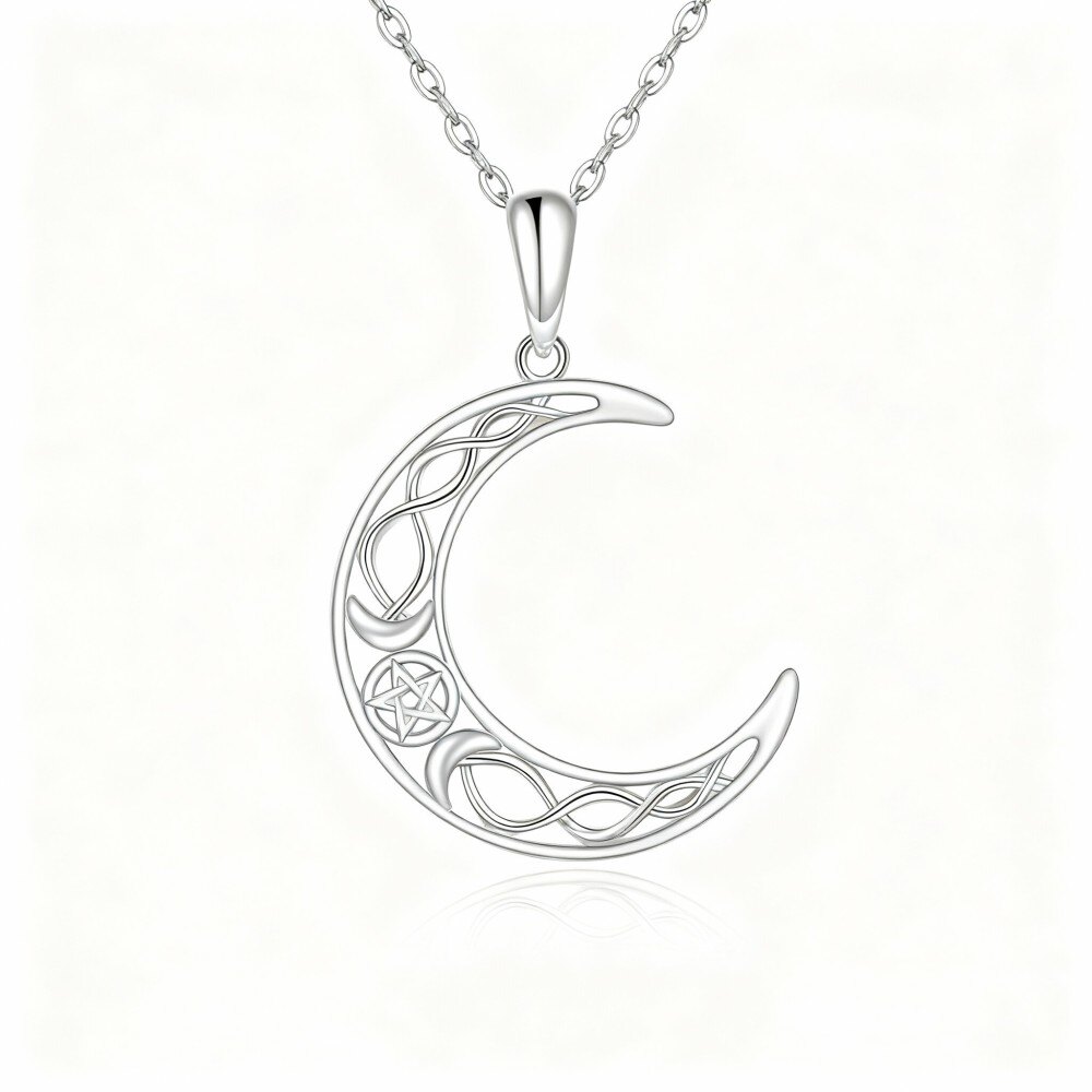 Erleben Sie die Schönheit unserer Platin Anhänger Halskette, entworfen für Frauen mit einem atemberaubenden keltischen Knoten und Mondmotiv.